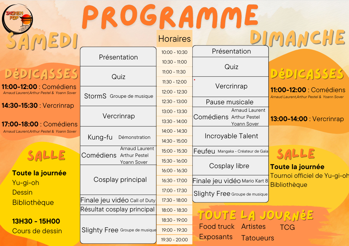 Programme: Après le succès de notre grande première, nous visons pour cette seconde édition un évènement plus grand. Shonen-Pop s’étendra sur 2 jours. La recette cependant reste la même, avec toujours des concours de cosplay, tournois de jeux vidéo, démonstrations, merchandising, et bien plus encore. La soirée du 24 sera bouclée par un petit concert et nous attendons quelques guests