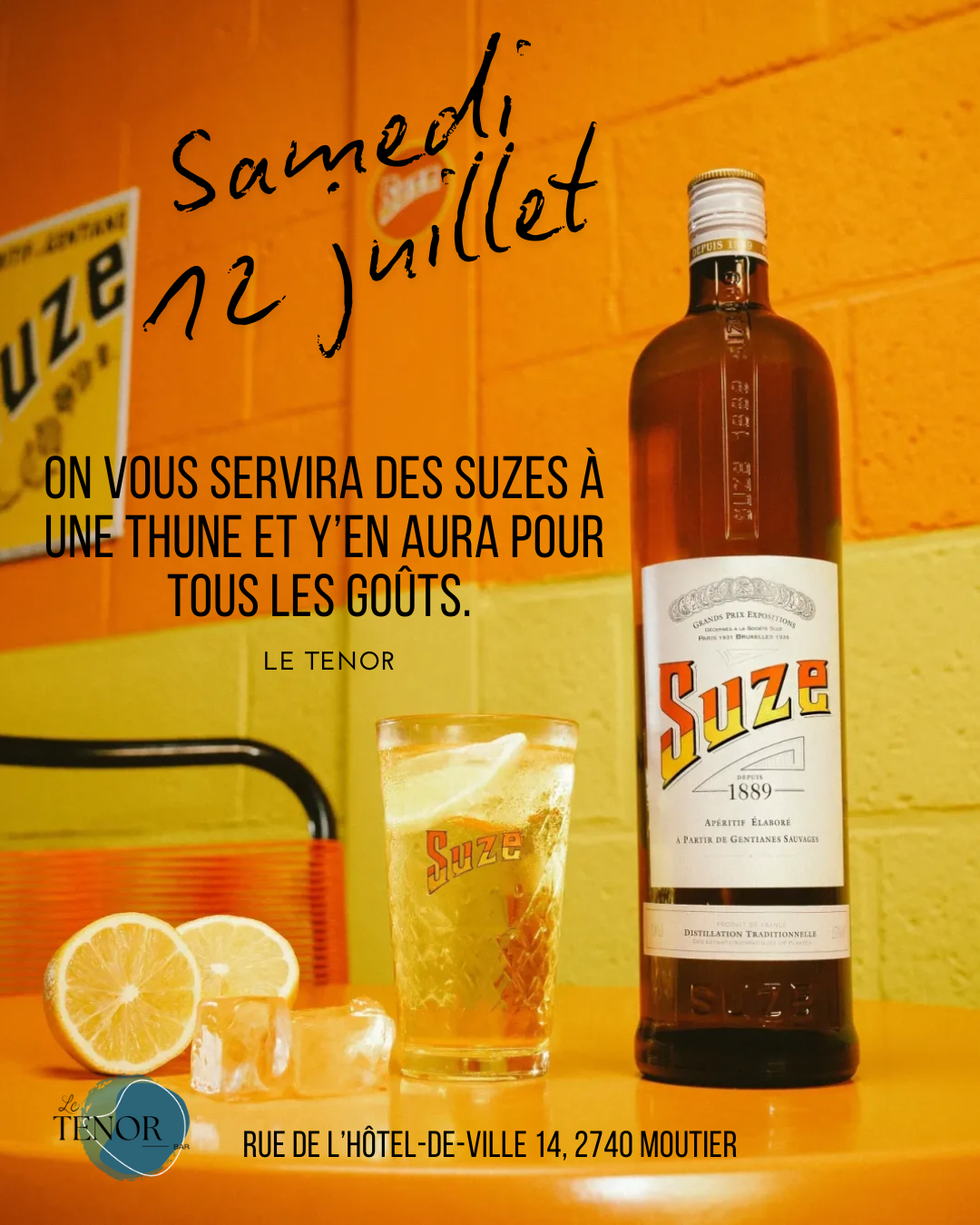 Soirée suze Date 12 Juil 2025 Expiré! Heure 17h00 Lieu Bar, le Tenor Rue de l'Hôtel-de-ville 14 Catégorie Bar